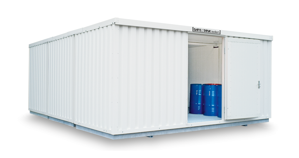 The insulated hazardous material container SAFE Tank STI up to 12 m² storage area is suitable for the storage of environmentally hazardous media which must be stored at a controlled temperature and/or protected from moisture.