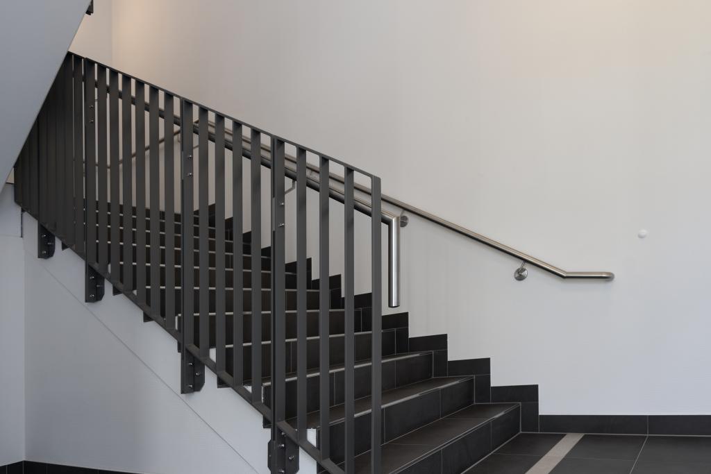 Rauchdichte Glastüren mit Alu-Rahmen führen in das in modernem Anthrazit geflieste Treppenhaus. Das Treppengeländer und eine Wandseite sind mit durchlaufenden Handläufen und einer zweiteiligen Handlaufstütze aus Edelstahlrohr ausgestattet.